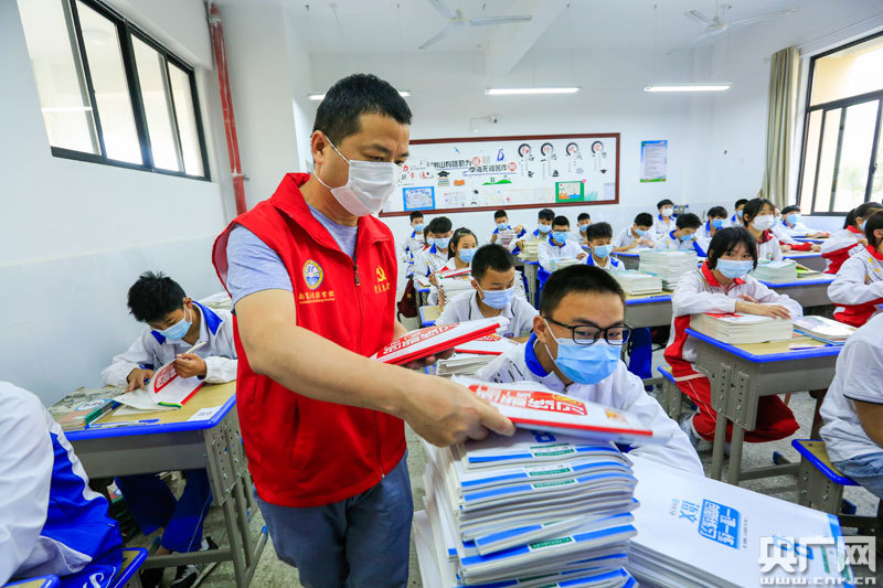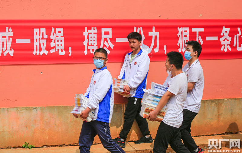 5月11日,在江西省九江市都昌縣萬里中學(xué),學(xué)生搬運(yùn)第二教材進(jìn)教室