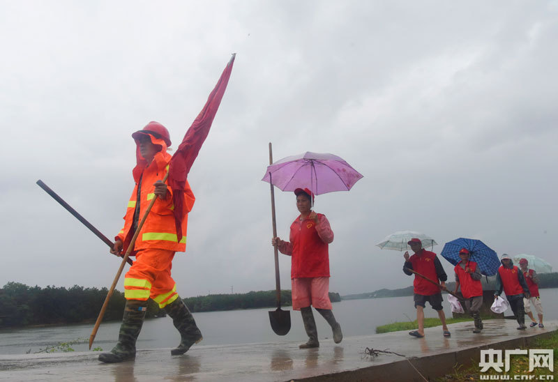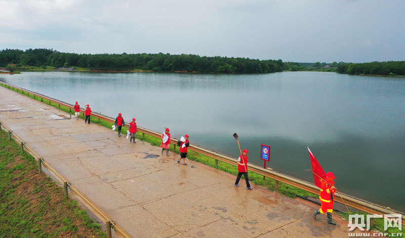 6月3日,在江西省吉安市吉州區(qū)曲瀨堤、萬碩水庫,由8名貧困戶組成的防汛巡邏隊(duì)正在巡查。