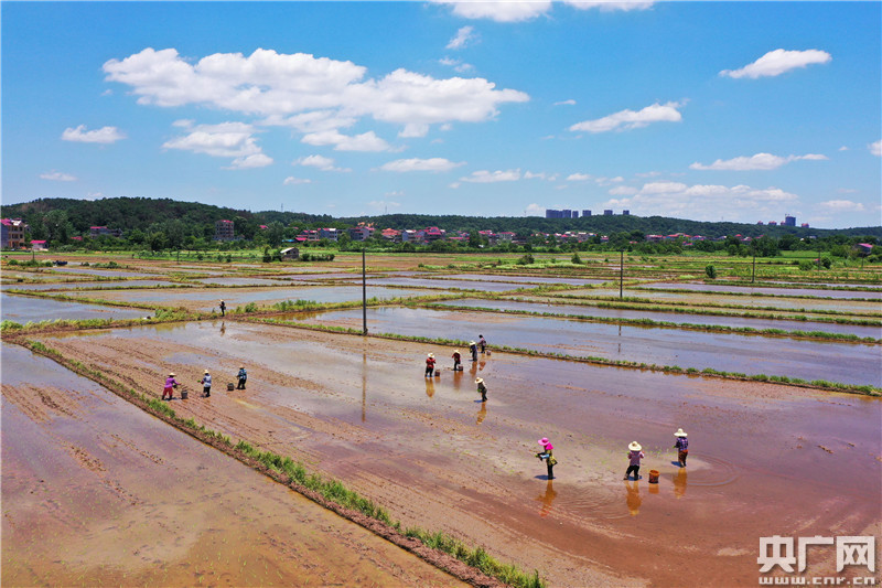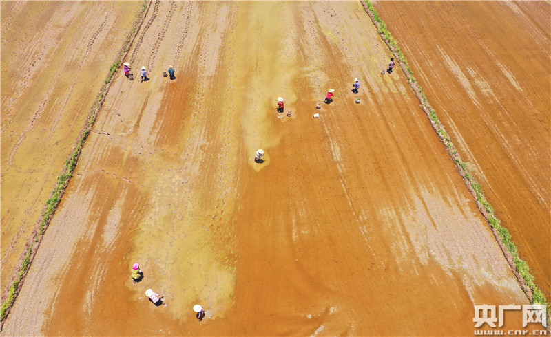 6月17日,在江西省吉安市泰和縣澄江鎮(zhèn)官溪村,農(nóng)民搶抓農(nóng)時(shí)正在播種中稻。