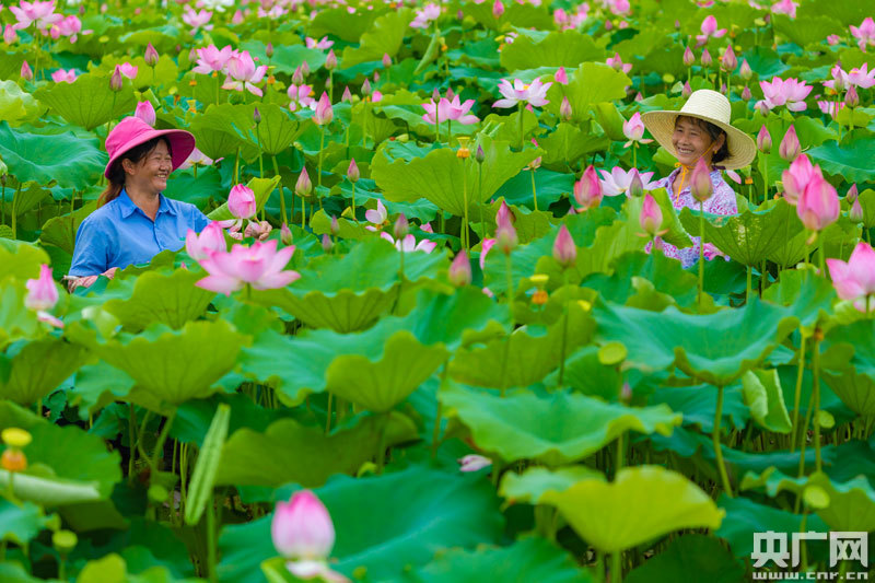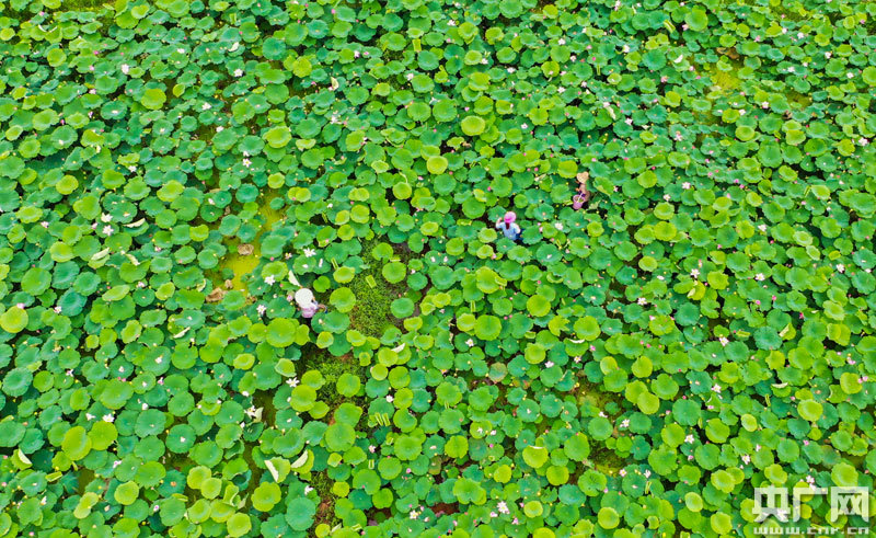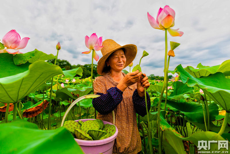 泰和縣苑前鎮(zhèn)戴坊村百畝生態(tài)蓮子種植基地,農(nóng)民正在采摘蓮蓬