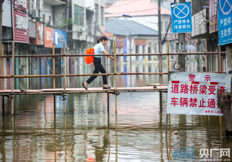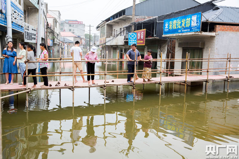 近日,受江西鄱陽(yáng)湖單退圩堤分洪影響,江西省九江市都昌縣春橋鄉(xiāng)集鎮(zhèn)中心地段被淹,人們出行受阻。為保障群眾出行安全,春橋鄉(xiāng)組織人員在街道主要通行路段,利用鋼管、木板在受淹路段搭建臨時(shí)便橋。