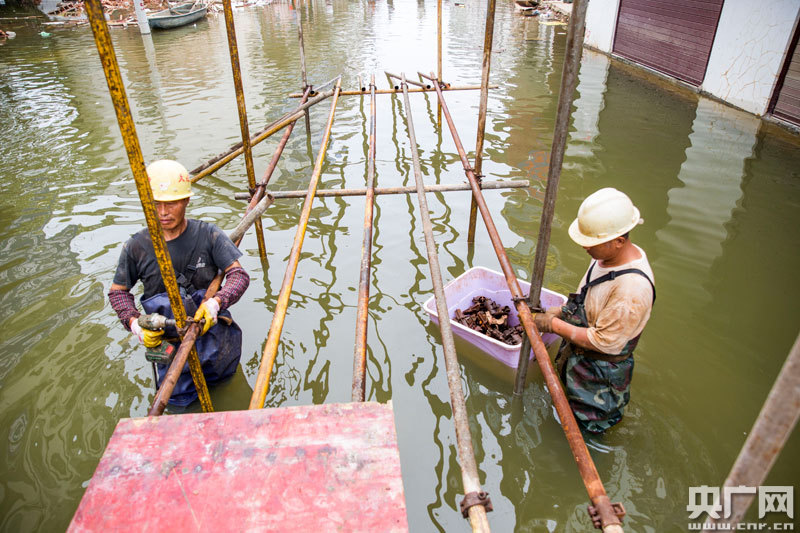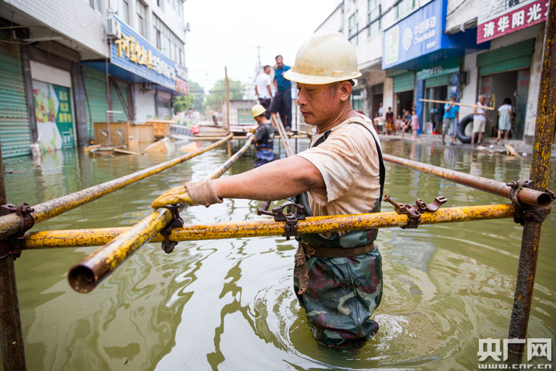 工人在受淹路段搭建便橋(央廣網(wǎng)發(fā) 通訊員傅建斌 攝)