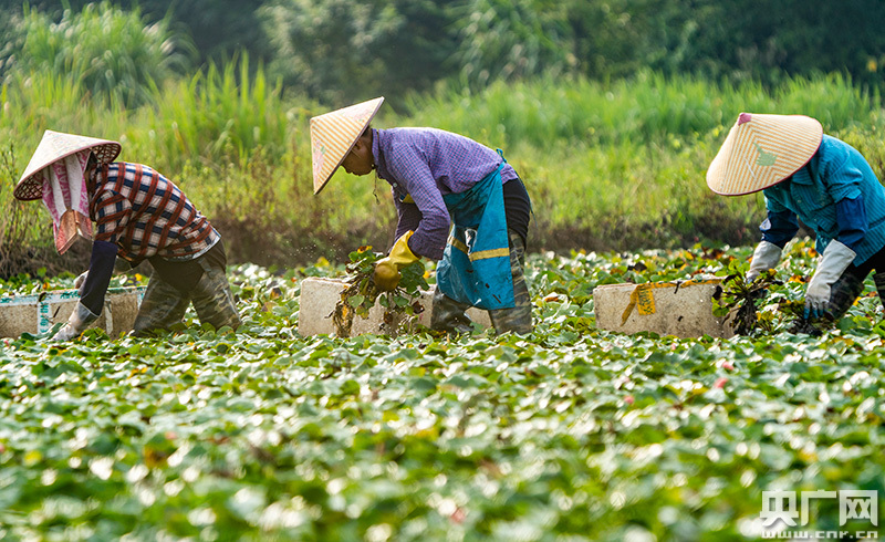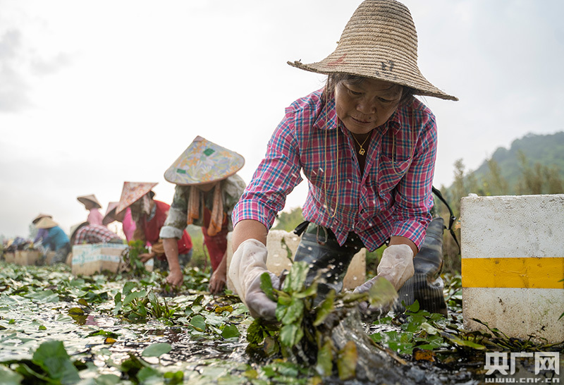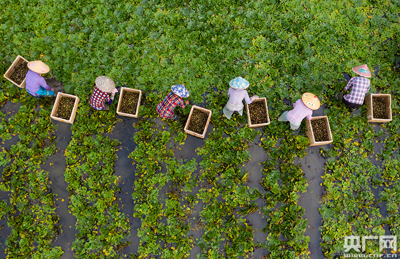 “大媽團(tuán)”正在水中采收菱角(央廣網(wǎng)發(fā) 通訊員趙春亮 攝)