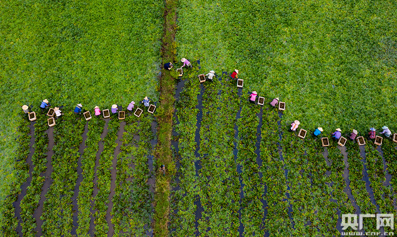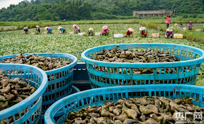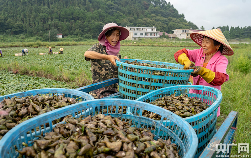 7月29日清晨,江西新余市分宜縣鳳陽鎮(zhèn)沔村200多畝菱角種植基地,由20多位農(nóng)民組成的山村“大媽團(tuán)”正在集中采收菱角。