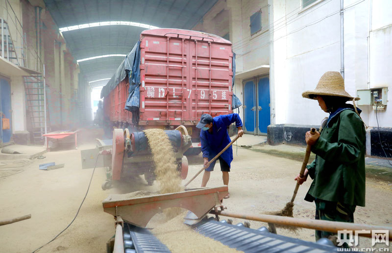 8月3日,江西省吉安市吉水縣朱山國家糧食儲備庫,工作人員正在收購夏糧入庫