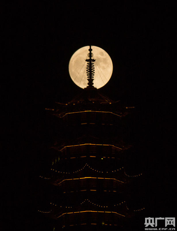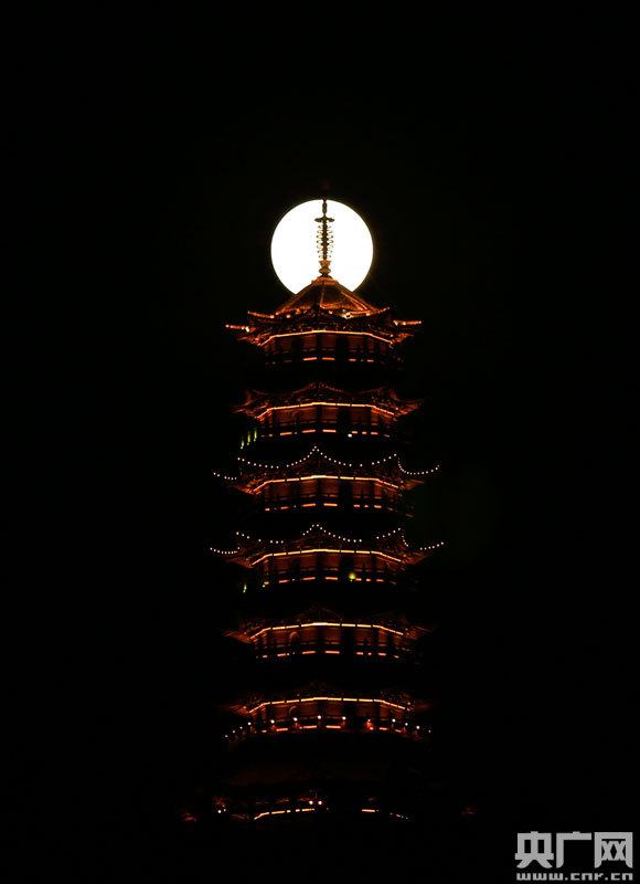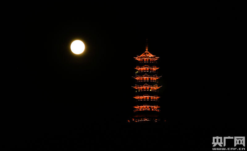 8月3日晚,在江西省九江市都昌縣南山公園上空,一輪明月從靈運塔后緩緩升起。