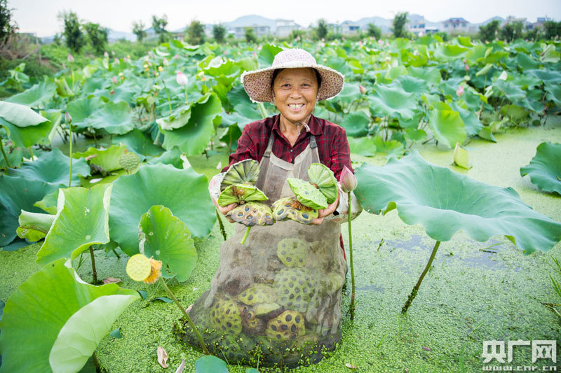 在都昌縣大樹鄉(xiāng)生態(tài)白蓮種植基地,農(nóng)民展示采摘的蓮蓬(央廣網(wǎng)發(fā) 通訊員傅建斌 攝)