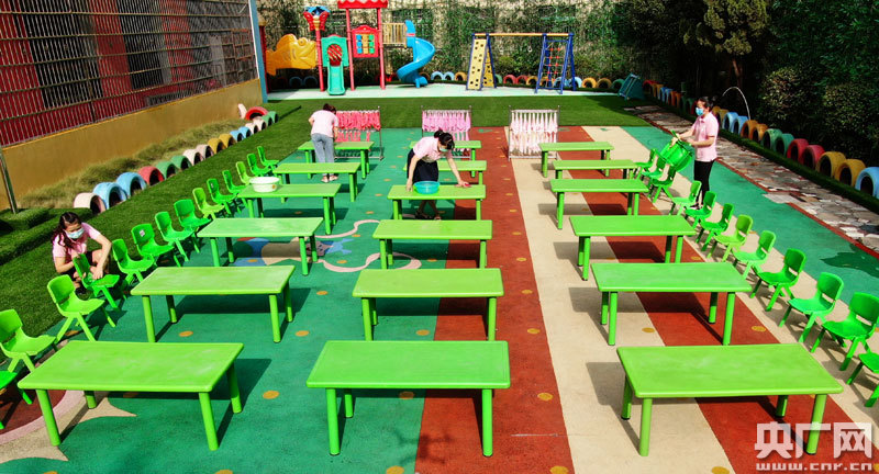 幼兒園老師們?cè)陂呦础⒘罆裾n桌(央廣網(wǎng)發(fā) 通訊員李軍 攝)
