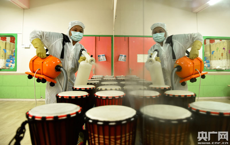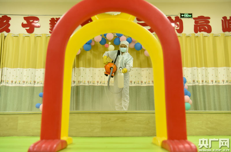幼兒園專業(yè)人員在為教室各角落、教學(xué)用品消毒(央廣網(wǎng)發(fā) 通訊員李軍 攝)