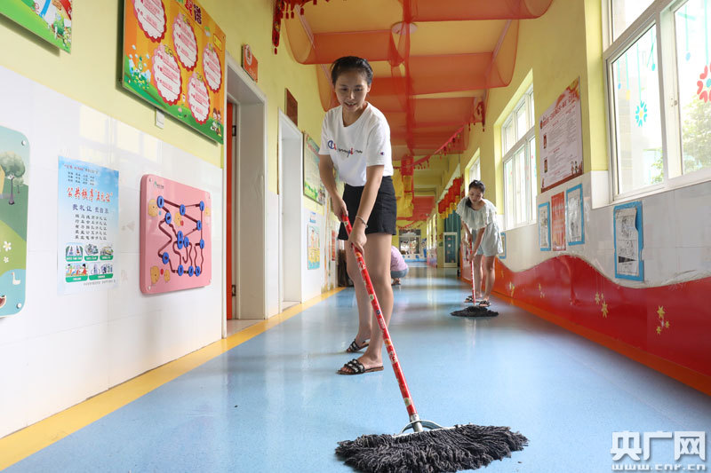 保育院老師正在清潔教室地面(央廣網(wǎng)發(fā) 通訊員李軍 攝)