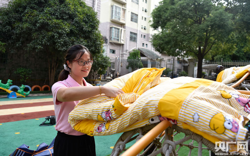 幼兒園老師趁著好天氣晾曬棉被(央廣網(wǎng)發(fā) 通訊員李軍 攝)