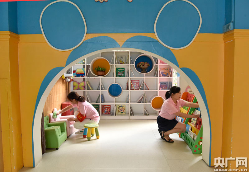 幼兒園老師整理小朋友們的書屋,迎接小朋友(央廣網(wǎng)發(fā) 通訊員李軍 攝)