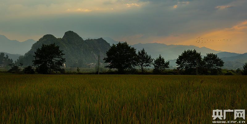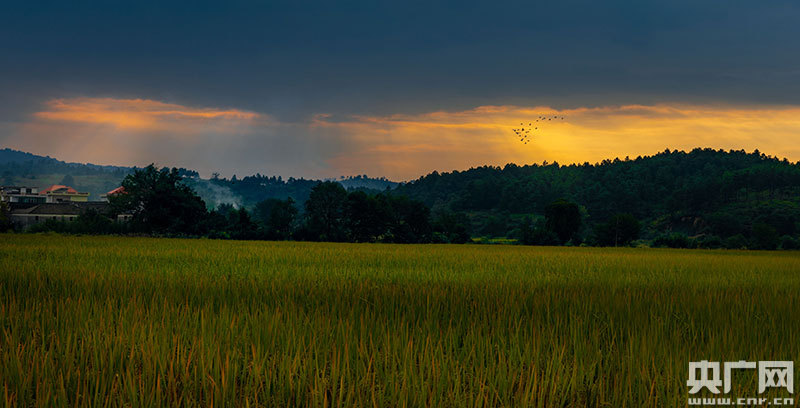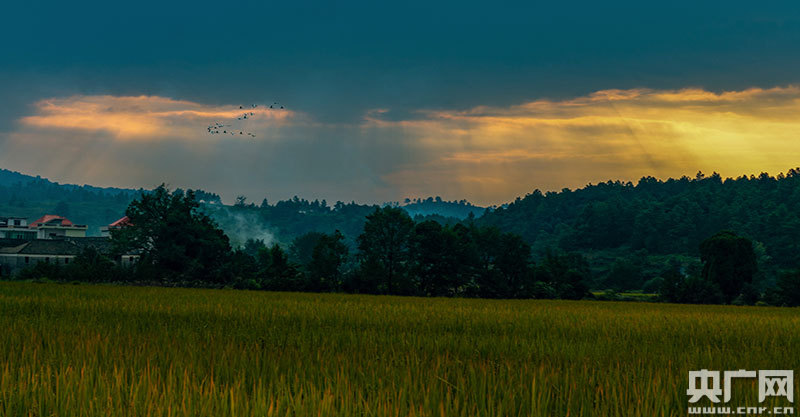 寒露時(shí)節(jié),在江西省永新縣,連片的稻田由青變綠,由綠變黃,像給原野鋪上一層金色的毯子,一群群南飛的候鳥與黛色的青山、金黃的大地構(gòu)成一幅和諧美麗的畫卷。