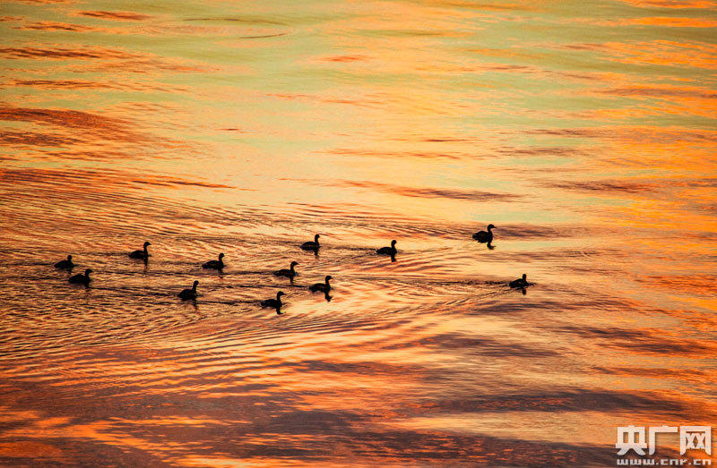 鄱陽湖都昌磯山水域,晚霞的映照下,一群水鳥在棲息、戲水