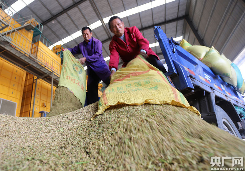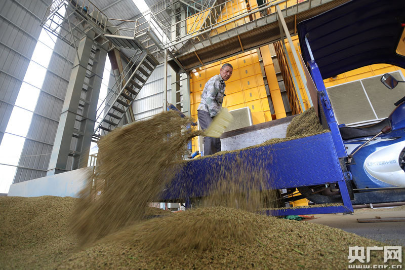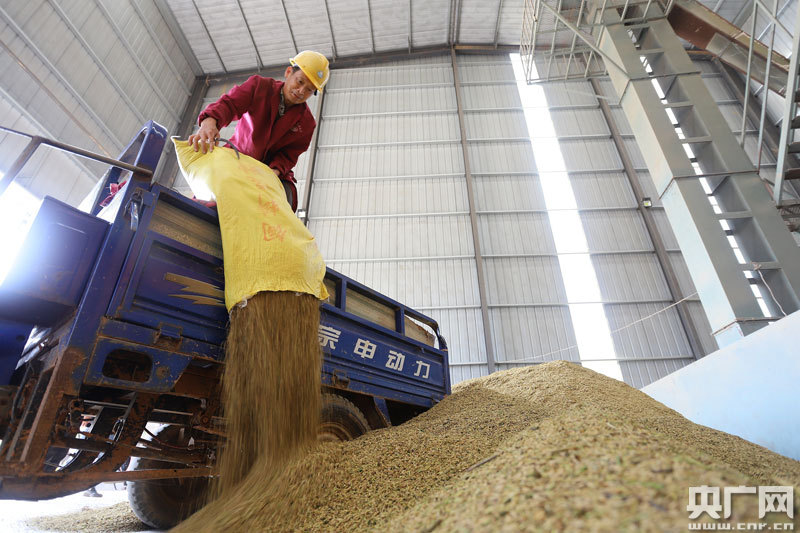 央廣網(wǎng)安福10月29日消息(記者王一凡 通訊員劉麗強(qiáng) 羅玉艷)近日,江西省吉安市安?h甘洛鄉(xiāng)博新農(nóng)機(jī)專業(yè)合作社負(fù)責(zé)人曹喜平忙得連胡子都不記得刮,眼下正是晚稻收割高峰期,售糧的農(nóng)戶接踵而至,合作社的糧食烘干廠一天到晚馬不停蹄地運(yùn)轉(zhuǎn),他走不開。“售糧的隊(duì)伍等你開門!辈芟财秸f(shuō),“都是附近村莊的農(nóng)民,有的種糧大戶一天就送來(lái)四五萬(wàn)斤。”