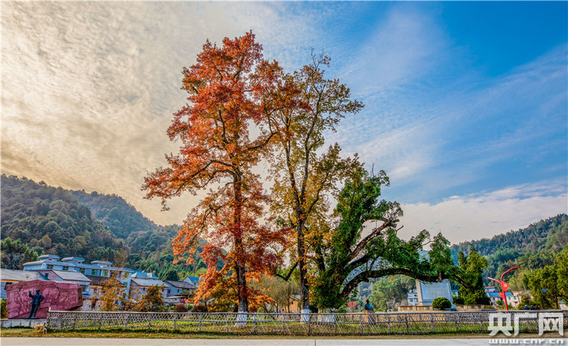 兩棵紅楓高80余米,與旁邊綠色的古樟相互依偎、相互映襯,顯得格外靚麗,成為三灣改編景區(qū)一道最美的風景。