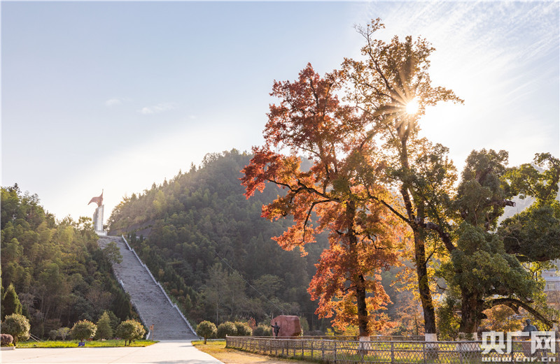 央廣網(wǎng)永新11月6日消息(記者胡斐 通迅員李平 郭建軍)進入深秋,江西省永新縣三灣改編舊址的兩棵紅楓褪去了一身綠色,開始變成了鮮艷的黃色和紅色,通紅在陽光下熠熠生輝,如黛遠山、紅色楓葉點燃了五彩斑斕的秋天。