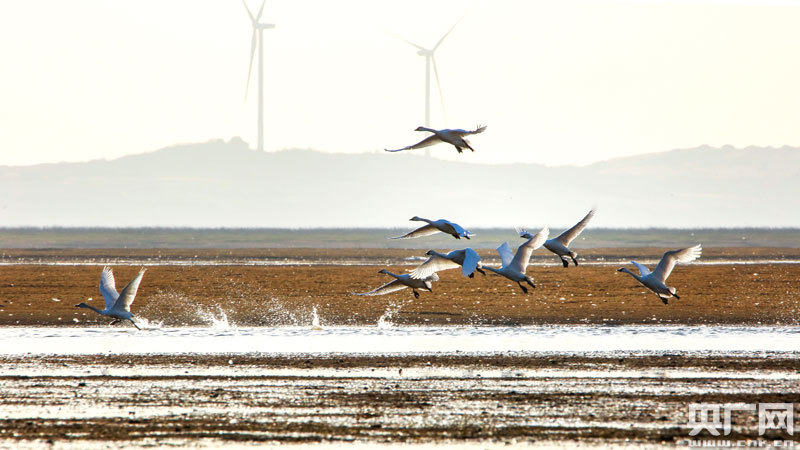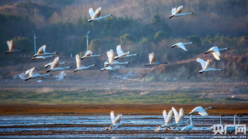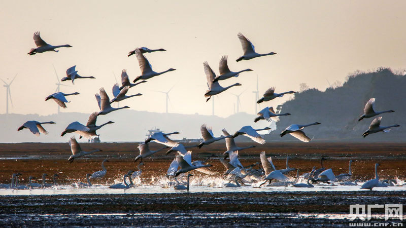 “啪,啪啪,啪啪啪……”隨著一陣翅膀擊水聲越來(lái)越響亮,越來(lái)越急促,一支由幾十只小天鵝組成的隊(duì)伍,正在從水面上起飛,直沖天穹。一會(huì)兒就排成了漂亮的隊(duì)伍,從記者的頭頂上飛過(guò),去尋找更理想的棲息地。小天鵝是敏感的,它懂得如何保護(hù)自己,善于觀察生存環(huán)境的細(xì)小變化,或許是幾聲相機(jī)的快門聲驚擾了它們,以至于在不知不覺(jué)中,迅速而優(yōu)雅的離去。