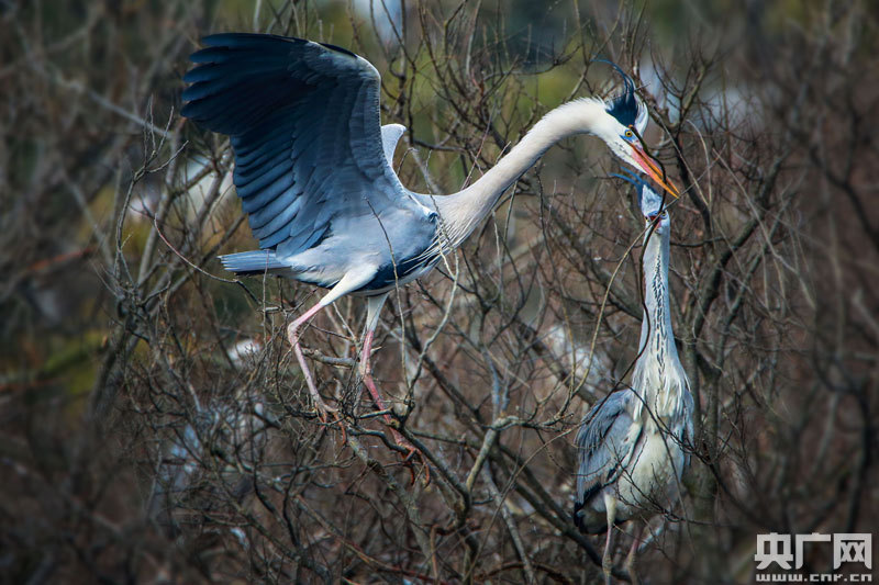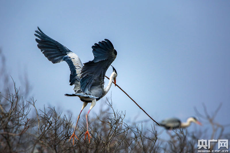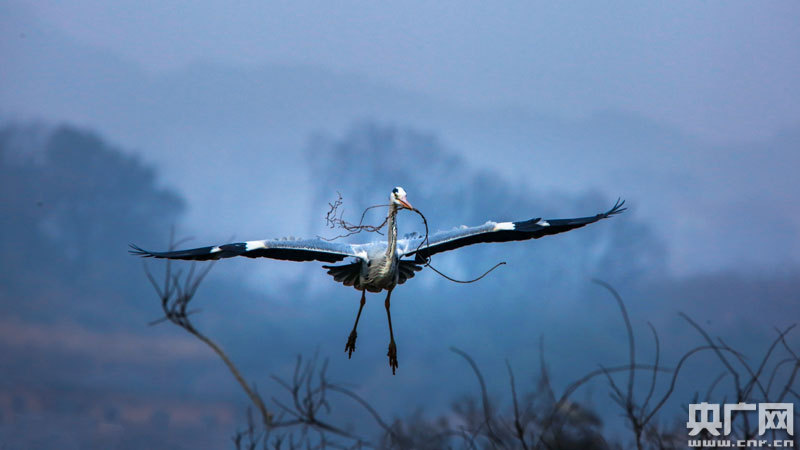 蒼鷺長途旅行回到達子咀后,大多數的“家庭”幾乎都在做著同一件事情。上年的巢已經被冬季的大風給摧毀了,無論是新婚還是舊愛,眼下最重要的活兒就是要對舊巢進行修葺。當然,更多的蒼鷺需要建筑新巢來生兒育女。因此,人們隨時可見蒼鷺口銜枝椏飛來飛去的身影。