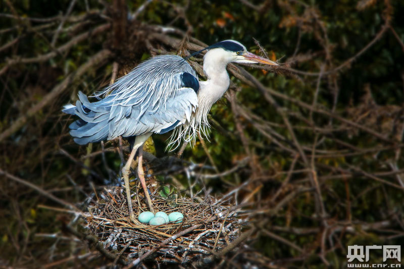 有時新居還沒全面完工,雌鷺就開始生產了,它一般能下3—5枚蛋,平均每兩天下一枚。孵化由雌雄雙方同時進行,雄鳥做巢孵化時雌鳥外出覓食,反之互換角色。要經過近一個月的操持,幼鳥才會出殼。孩子們出世后,蒼鷺爸媽就再也不得清閑了。