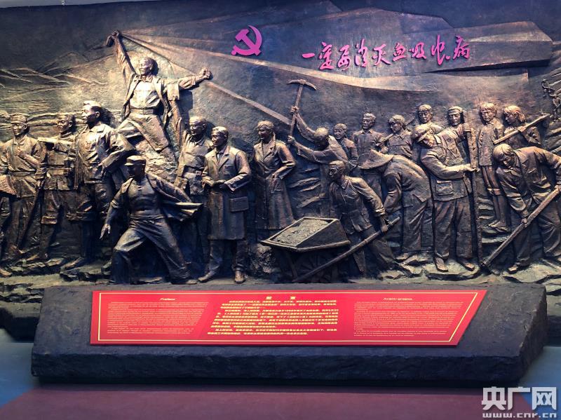 中國血防紀(jì)念館展示的滅螺大會的大型浮雕(央廣網(wǎng)發(fā) 趙小羽攝)