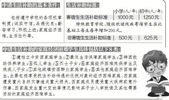 根據(jù)《辦法》,生活補(bǔ)助分為寄宿生生活補(bǔ)助和非寄宿生生活補(bǔ)助。生活補(bǔ)助主要用于受助學(xué)生的生活費(fèi)開支。