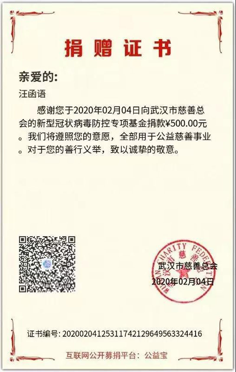 了卻心愿后,汪函語十分開心;氐郊依锖螅覺得自己做的不夠,又拿出今年的500元壓歲錢,在網(wǎng)上捐獻(xiàn)給武漢慈善總會(huì)。