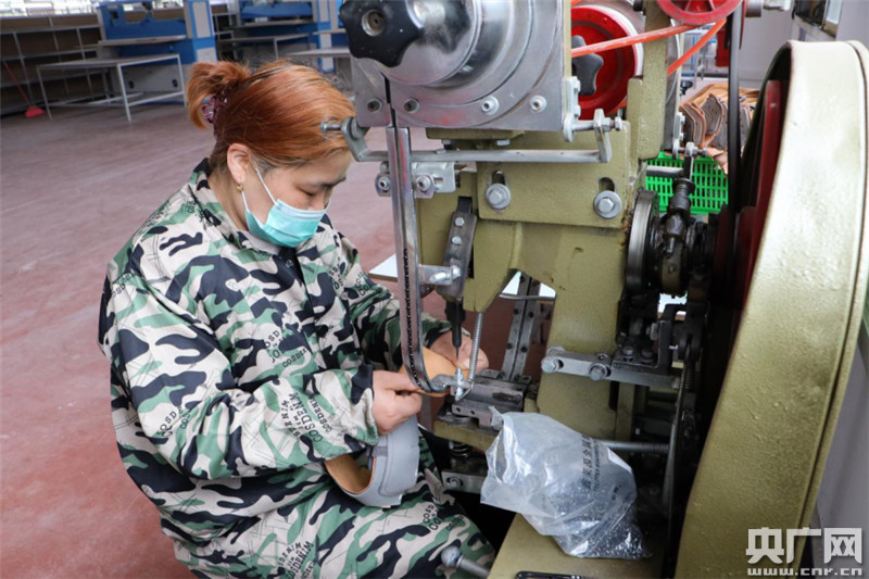 貧困戶張秋云正在進(jìn)行鞋面加工