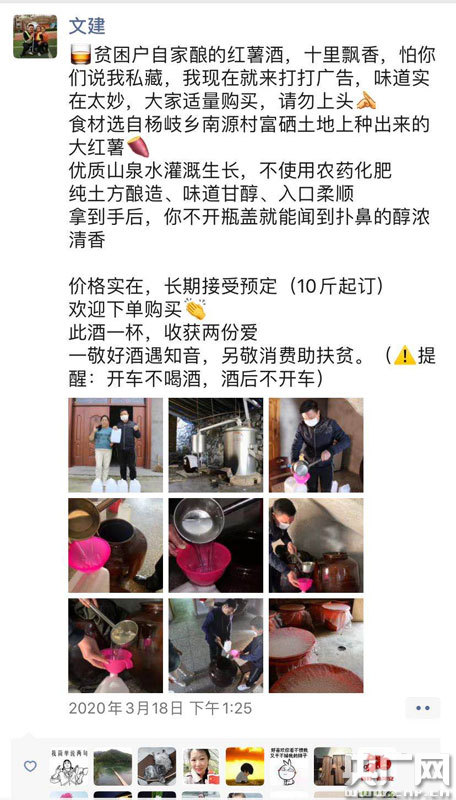 眼下正是梁國強釀酒的時機,為了讓他銷量跟上產量,文建為他發(fā)了第一條“帶貨”朋友圈,“一敬好酒遇知音,另敬消費助扶貧!边@句“廣告”讓文建拿到不少訂單,直接賣掉紅薯酒460斤,按照10元一斤的市場價,梁國強2020年收入已增加4600元!拔臅泿臀忆N售了不少酒,還幫我送貨,實在太貼心了。”梁國強感激地說道。一筆筆訂單從微信傳來,還有不少回頭客,梁國強一家干勁十足。