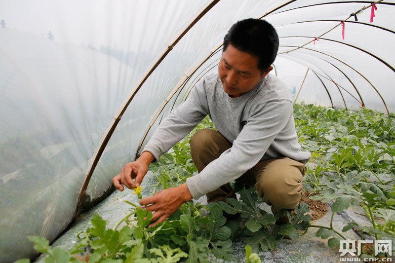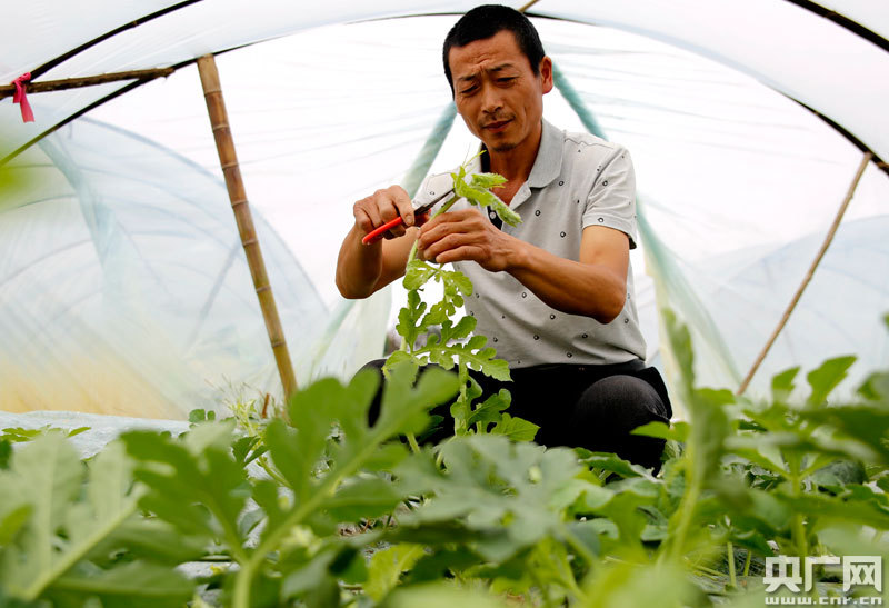 陳鳳生正在悉心給西瓜苗剪枝蔓