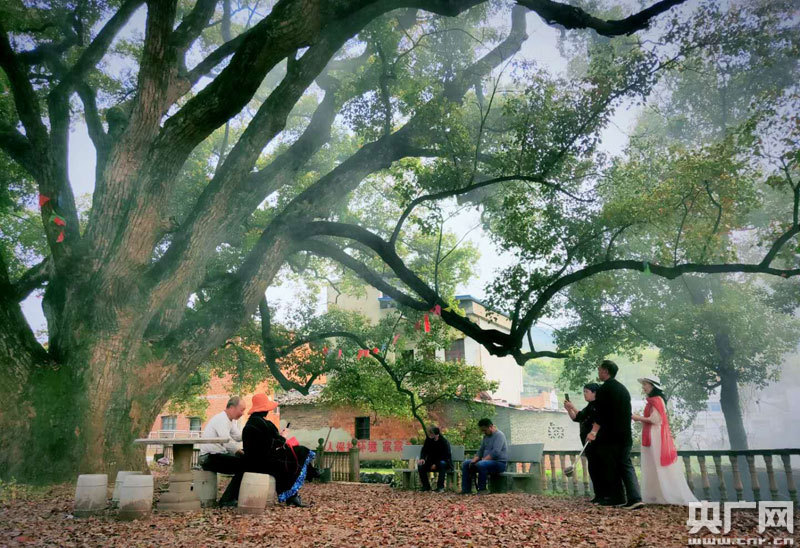 大禾塘茶園尖自然村村口,有兩株樹齡近千年的紅豆杉,胸徑達(dá)3米,高約20多米,格外引人注目,被當(dāng)?shù)卮迕穹Q為“夫妻樹”、“愛情樹”。秋冬時(shí)節(jié),一顆顆晶瑩剔透、艷似瑪瑙的紅豆杉果掛滿枝頭。伴隨著森林游、周末游、健康游的興起,不少市民紛紛前來“打卡”,兩棵千年古樹又變身為“網(wǎng)紅樹”,一些青年情侶也在樹下拍抖音、發(fā)朋友圈,讓古樹見證堅(jiān)貞不渝的誓言,許下未來生活的美好期盼。
