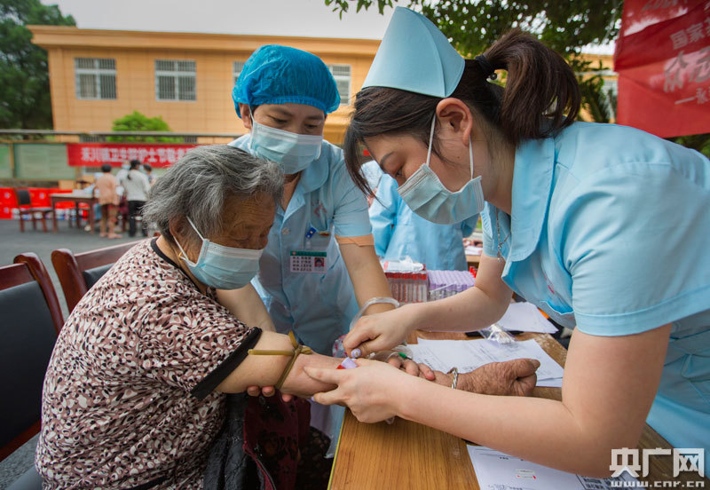 5月11日,江西省永新縣禾川鎮(zhèn)敬老院,該鎮(zhèn)衛(wèi)生院護(hù)士志愿者為老人抽血化驗(yàn)
