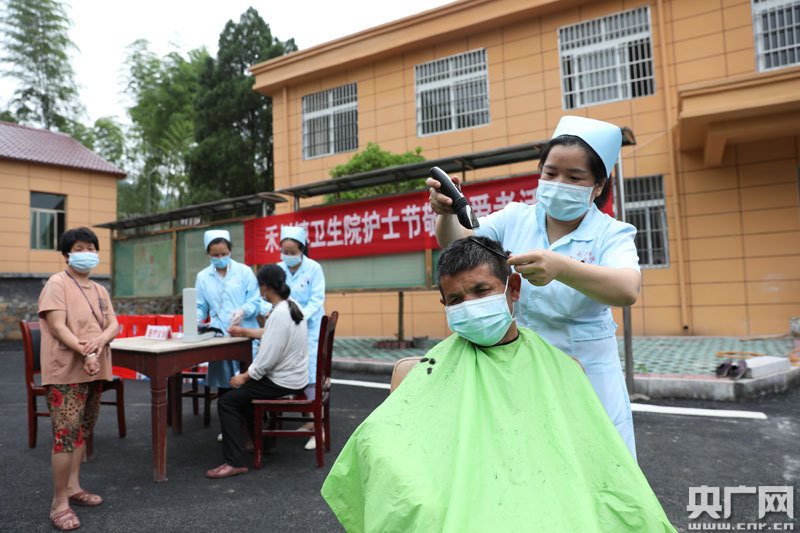 5月11日,江西省永新縣禾川鎮(zhèn)敬老院,該鎮(zhèn)衛(wèi)生院護(hù)士志愿者為老人理發(fā)