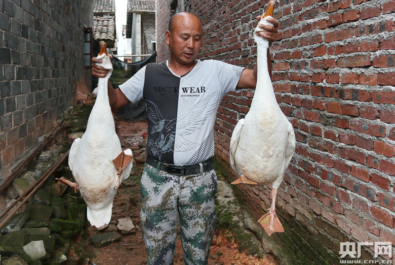 脫貧戶(hù)饒勝文向上門(mén)收購(gòu)肉鵝的商販展示壯碩的肉鵝