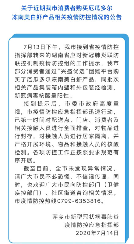 7月14日,江西省萍鄉(xiāng)市委宣傳部發(fā)布《關(guān)于近期我市消費(fèi)者購(gòu)買厄瓜多爾凍南美白蝦產(chǎn)品相關(guān)疫情防控情況的公告》。