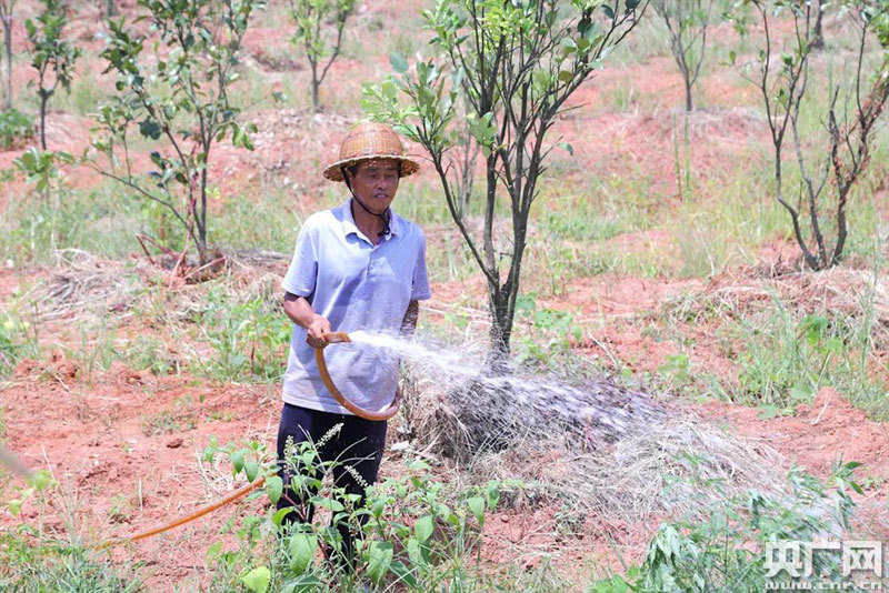 貧困戶正在林里為馬家柚澆水(央廣網(wǎng)發(fā) 通訊員供圖)
