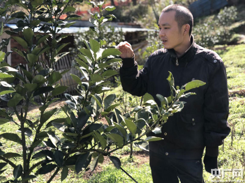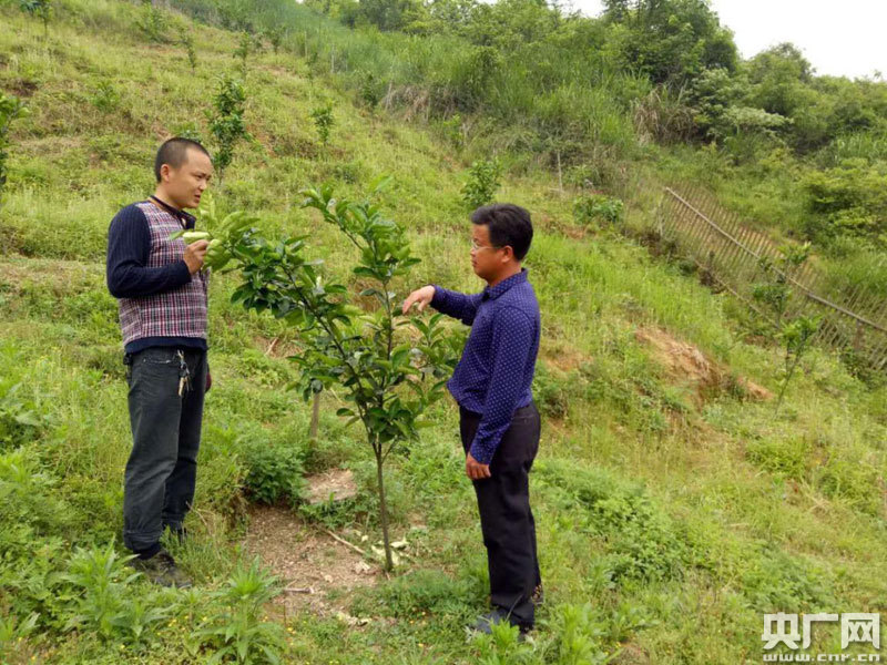 譚中華檢查新種的柚子樹(shù)長(zhǎng)勢(shì)(央廣網(wǎng)發(fā) 通訊員供圖)