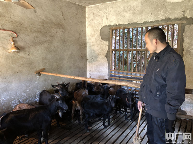 譚中華在羊圈清點(diǎn)黑山羊數(shù)目、檢查山羊有無(wú)異樣(央廣網(wǎng)發(fā) 通訊員供圖)