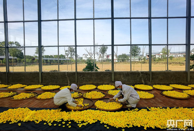 工作人員正在分揀新鮮采摘的金絲皇菊(央廣網(wǎng)發(fā) 通訊員供圖)