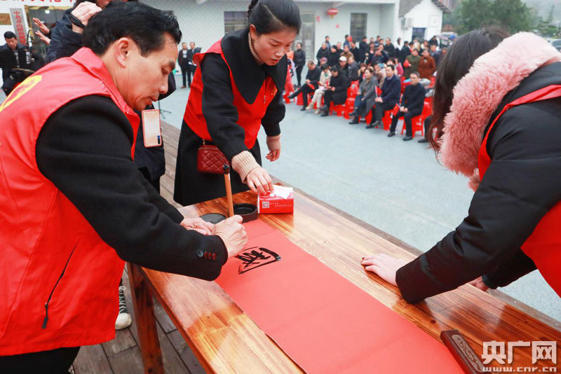 “我們書法宣講團(tuán)每年國慶、春節(jié)等重大節(jié)日都會免費(fèi)送手寫對聯(lián)給群眾,家家戶戶貼上贊美國家和美好生活的對聯(lián)已經(jīng)成為了青山的特色!鞭r(nóng)民藝術(shù)家劉庚偉一邊寫著書法一邊給我們介紹宣講團(tuán)的故事。