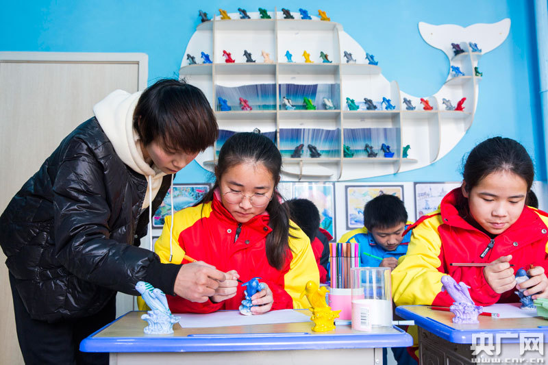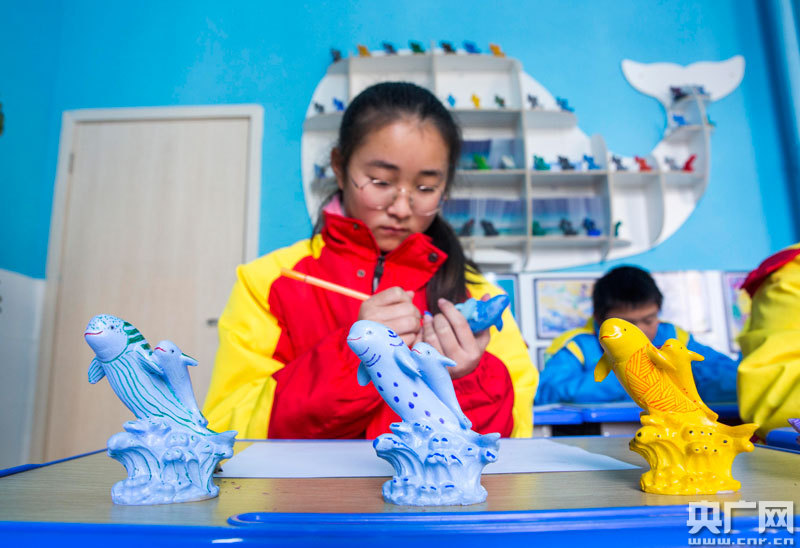 在“江豚教室”,學(xué)生在手繪江豚模型(央廣網(wǎng)發(fā) 通訊員傅建斌 攝)