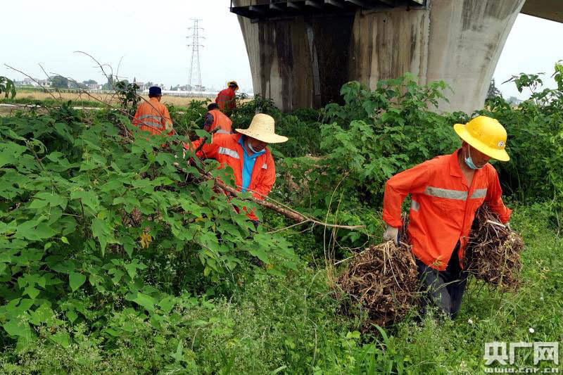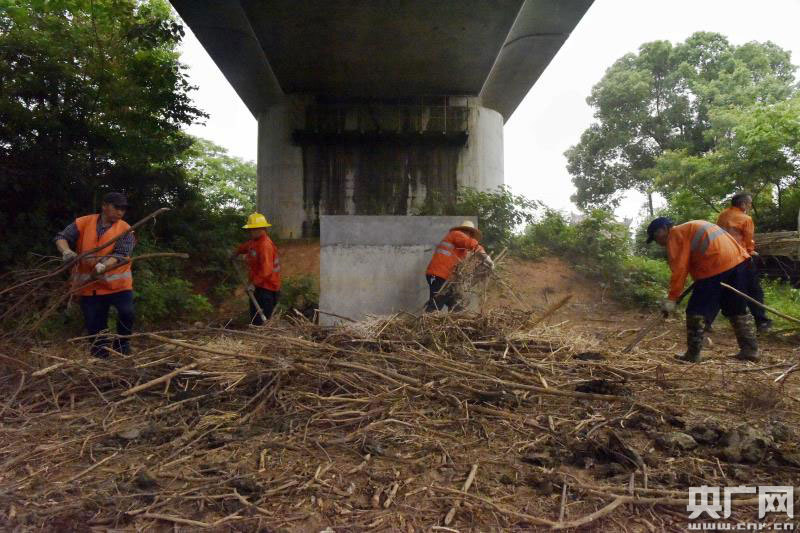 5月9日,九江橋工段永修路橋車(chē)間作業(yè)人員對(duì)村民堆放的柴木進(jìn)行清理。(央廣網(wǎng)發(fā) 通訊員黃旸攝)