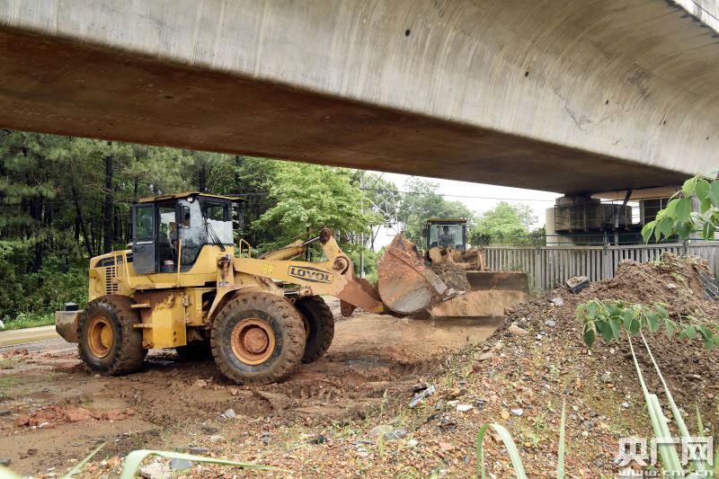 5月9日,現(xiàn)場(chǎng)作業(yè)人員聯(lián)系鐵路沿線工廠負(fù)責(zé)人,現(xiàn)場(chǎng)調(diào)度挖掘機(jī)將堆放在橋墩下的建筑垃圾清理鏟運(yùn)。(央廣網(wǎng)發(fā) 通訊員黃旸攝)