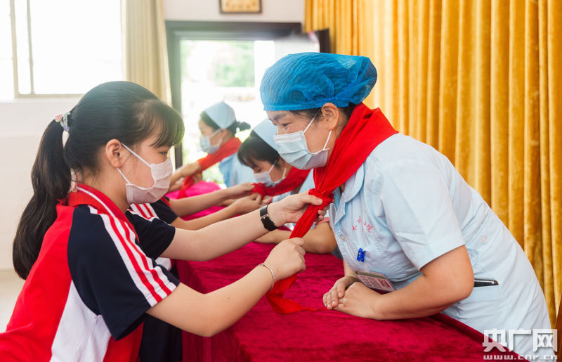 永新縣城西小學(xué),孩子們?yōu)榘滓绿焓勾骷t領(lǐng)巾(央廣網(wǎng)發(fā) 通訊員 攝)