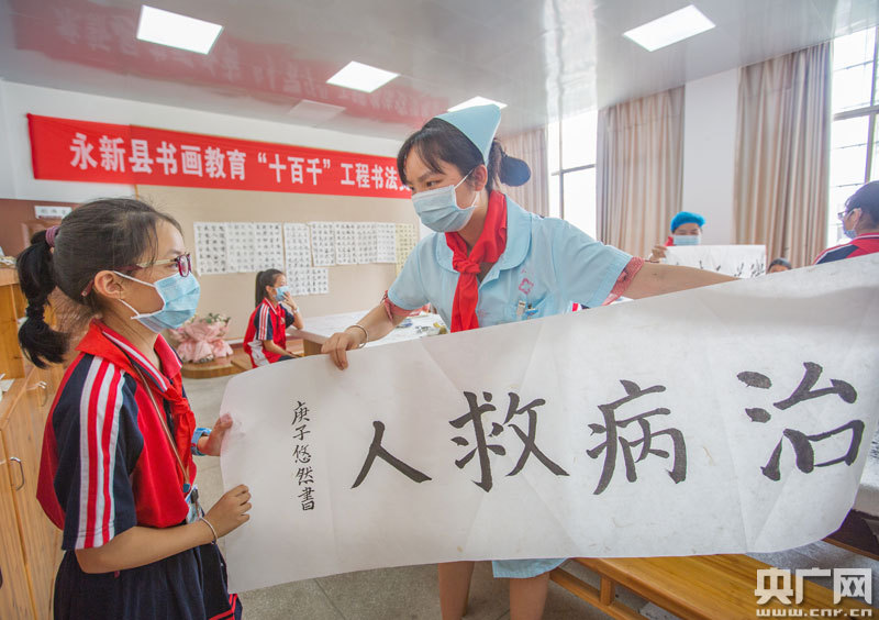 學(xué)生贈送書法作品給白衣天使(央廣網(wǎng)發(fā) 通訊員 攝)