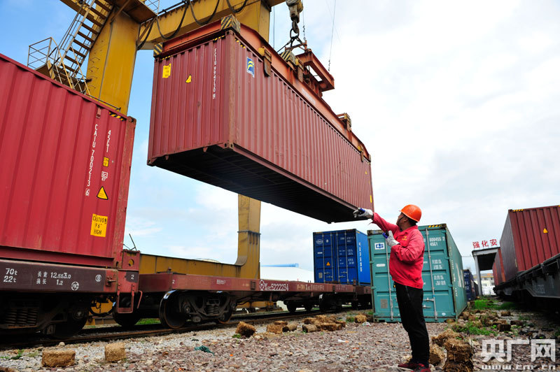 發(fā)車(chē)前口岸工作人員指揮貨集裝箱裝車(chē)