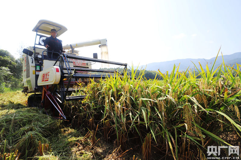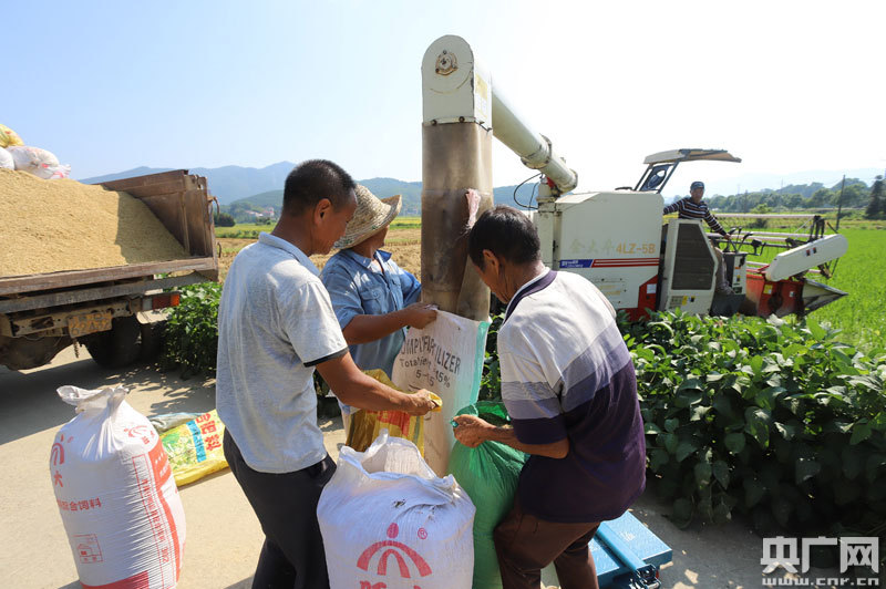 安?h洋溪鎮(zhèn)塘里村村民在收割中稻(央廣網(wǎng)發(fā) 通訊員劉麗強(qiáng) 攝)