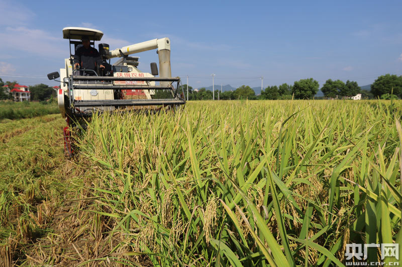 央廣網(wǎng)安福8月18日消息(記者王一凡 通訊員劉麗強(qiáng) 賀更清)8月18日,江西省吉安市安?h洋溪鎮(zhèn)塘里村陳凡才忙得上衣濕透了,他家的3畝中稻熟了,江蘇來(lái)的“割禾客”在幫他家收割稻子!爱產(chǎn)估計(jì)有1200斤,比往年畝均增長(zhǎng)30多斤!标惙膊胖钢谧鳂I(yè)的收割機(jī)說(shuō)。