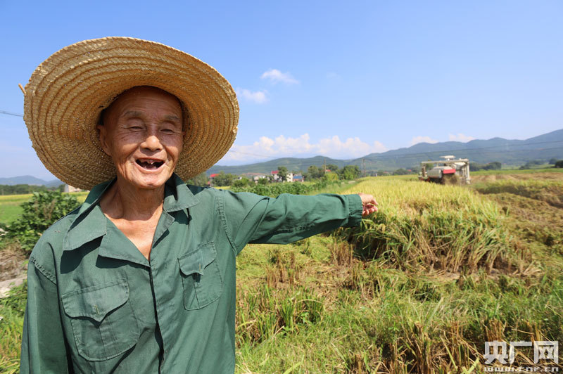 安?h洋溪鎮(zhèn)塘里村村民陳凡才在介紹他家的中稻生產(chǎn)情況(央廣網(wǎng)發(fā) 通訊員劉麗強(qiáng) 攝)