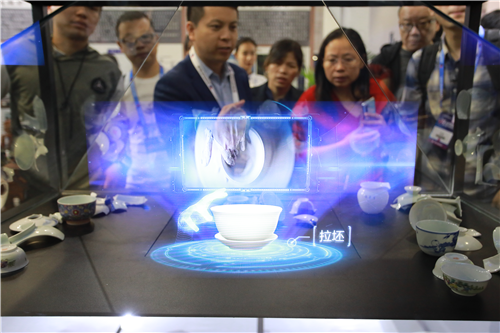 這是利用全息投影技術(shù)、3D影視特效技術(shù)和建模技術(shù),完整還原陶瓷制作流程的平臺(tái)。通過(guò)各項(xiàng)技術(shù),生動(dòng)地展示了拉坯、修坯、裝飾、燒制等傳統(tǒng)制瓷工藝流程,將古典手工制瓷形、釉、畫(huà)與影視特效完美結(jié)合,最終呈現(xiàn)出蘊(yùn)含金木水火土五行元素的百子瓷碗。將現(xiàn)代科技融入傳統(tǒng)文化,讓陶瓷文化更好的傳承和發(fā)揚(yáng)。